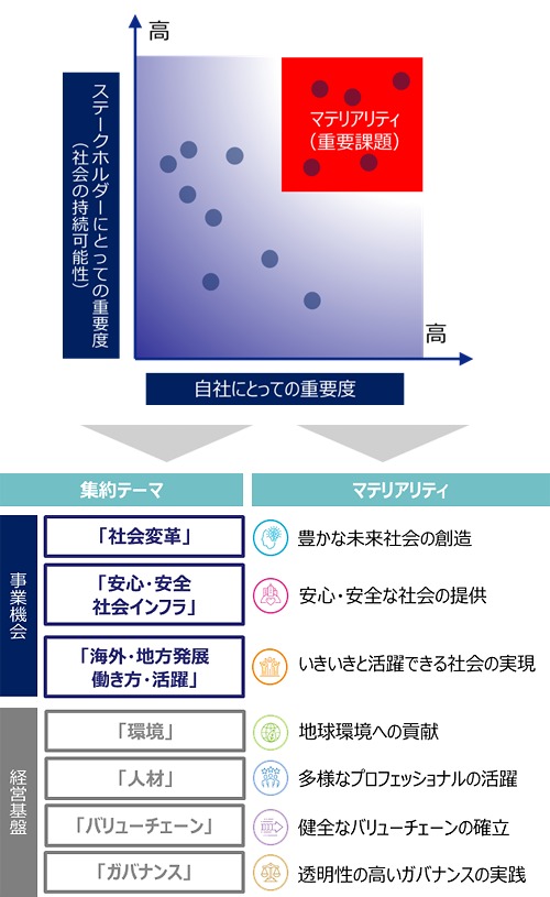 社会とともに成長するために、特に重要と捉え優先的に取り組む課題をマテリアリティとして策定しました。