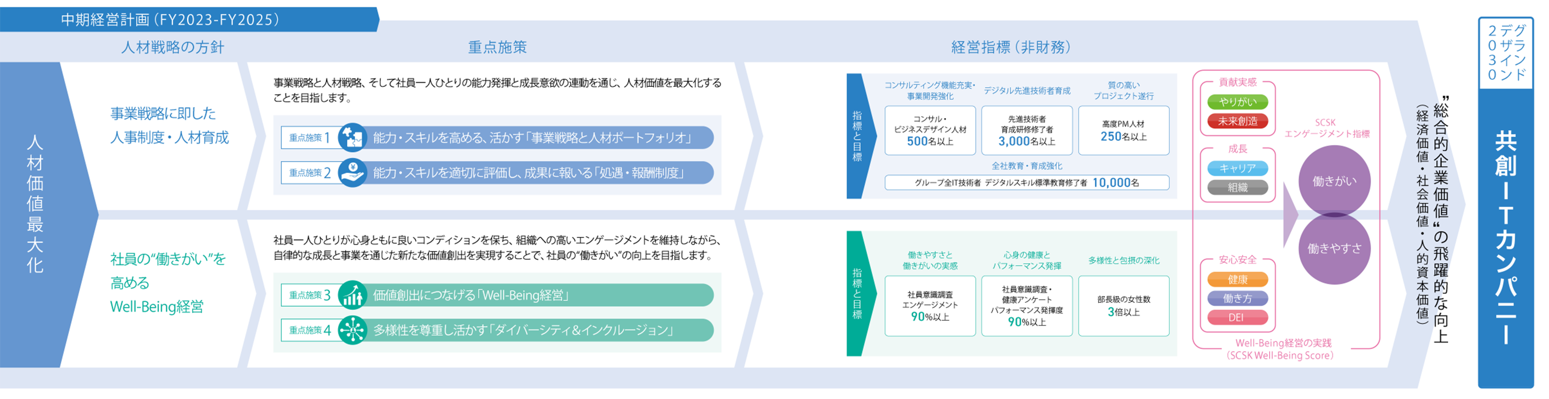 中期経営計画では、「経済価値」と「社会価値」「人的資本価値」等の非財務要素を包含した企業価値である"総合的企業価値"の飛躍的な向上に取り組むことを方針として掲げています。人的資本価値の向上については、社員一人ひとりの「人材価値最大化」を基本方針とし、社員の能力開発(専門性、スキル、経験等)への投資と共に、社員の能力を高められる事業・案件を常に選択し、成長できる場・環境を用意すること、また、社員が持つ能力を最大限に発揮できる事業分野・事業モデルを常に選択・構築することに取り組んでいます。また、これまでの働き方改革や健康経営を中心に培ってきた働きやすい環境に加え「働きがい」を実感できる会社を目指し、社会価値や経済価値創出への貢献を通じた働きがいやエンゲージメントを高めるWell-Being経営を推進しています。