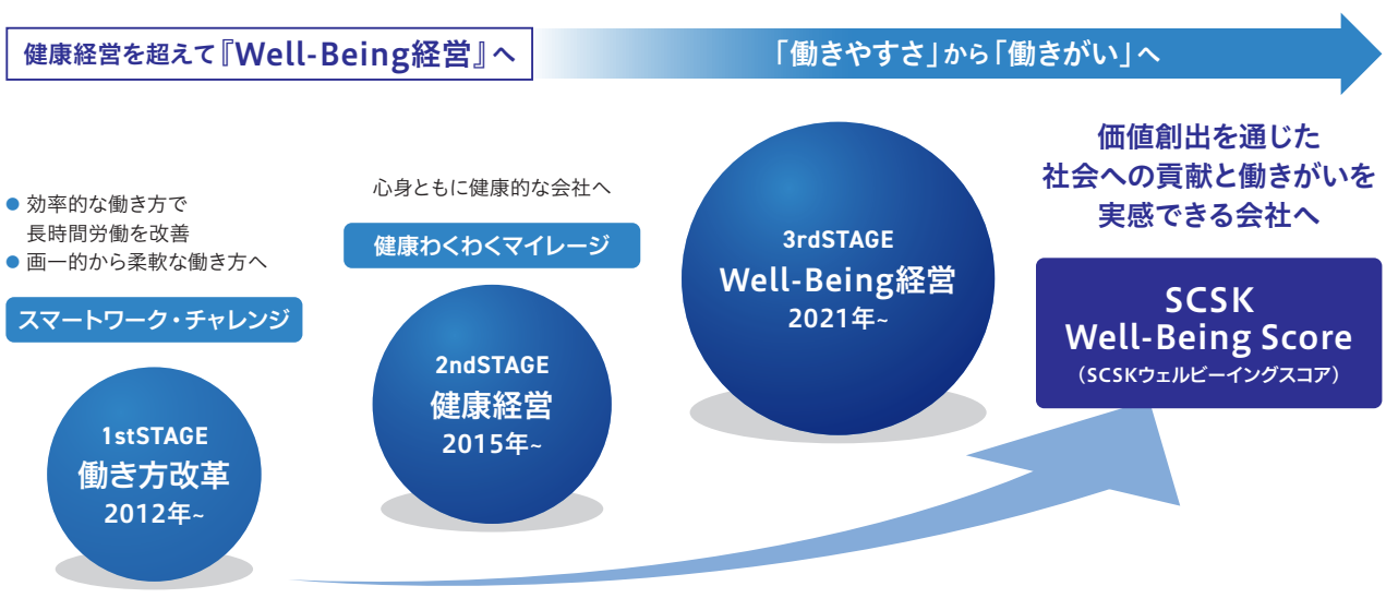 SCSKグループは、今後とも「健康経営」を経営戦略の根幹に置き、社員の健康増進に向けた施策を継続・強化するのに加え、さらに一歩進めて、全員が仕事を通じて働きがいや心の豊かさを感じられる「Well-Being経営」に取り組んでいます。社員が心身ともに満たされ、意欲と充実感をもって働く環境を作り、社会への貢献と働きがいを実感できる会社となることにより、SCSKグループが推し進める「サステナビリティ経営」の実践と持続可能な成長を実現できると考えています。