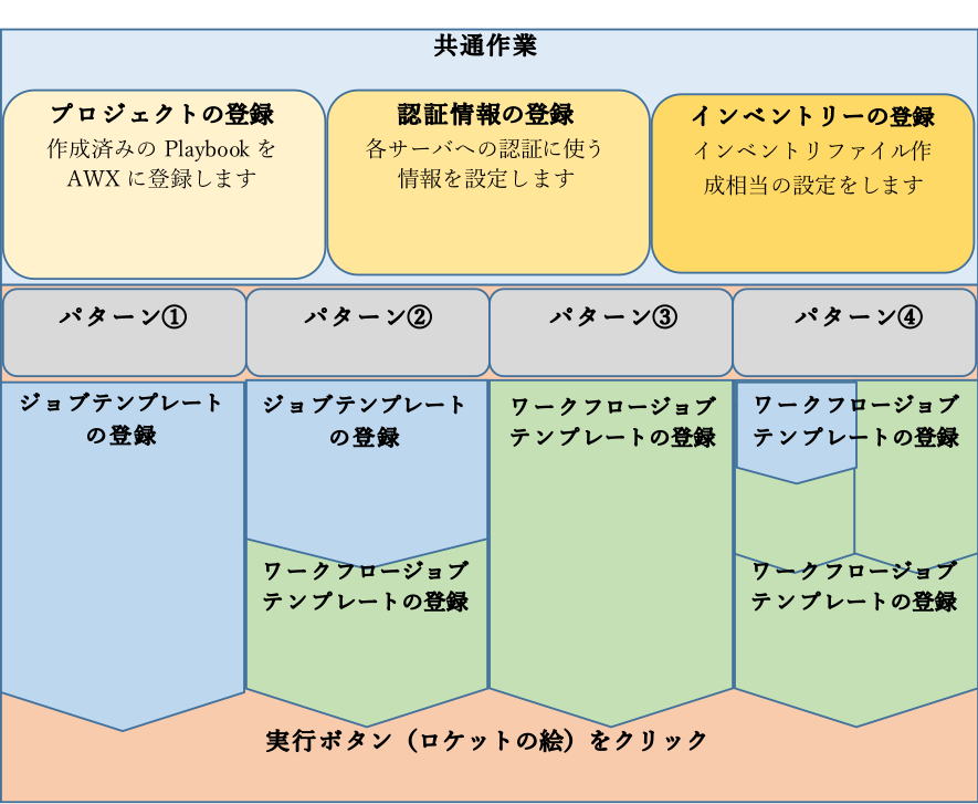 | パターン② | ジョブテンプレート(パターン①のセット)を順番に実行します ホスト・グループはジョブテンプレート毎に変更できます | DBserverグループにMySQL、APserverグループにTomcat、WebserverグループにApacheをインストールする |