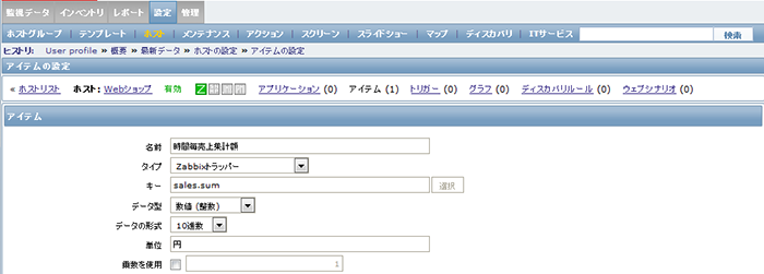 ホストとして、ホスト名が「webshop1」というホストと、そのホストに関するアイテムとして名前が「時間毎売上集計額」、キーが「sales.sum」、タイプは「Zabbixトラッパー」、型が「数値(整数)」というように、ホストとアイテムを作成しておきます。