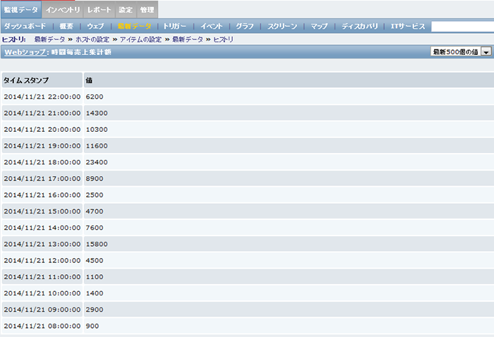 ホストの名前は「webshop1」(表示名は「Webショップ」)で、値を保存するためのアイテムのキーは「sales.sum」であったとします。
