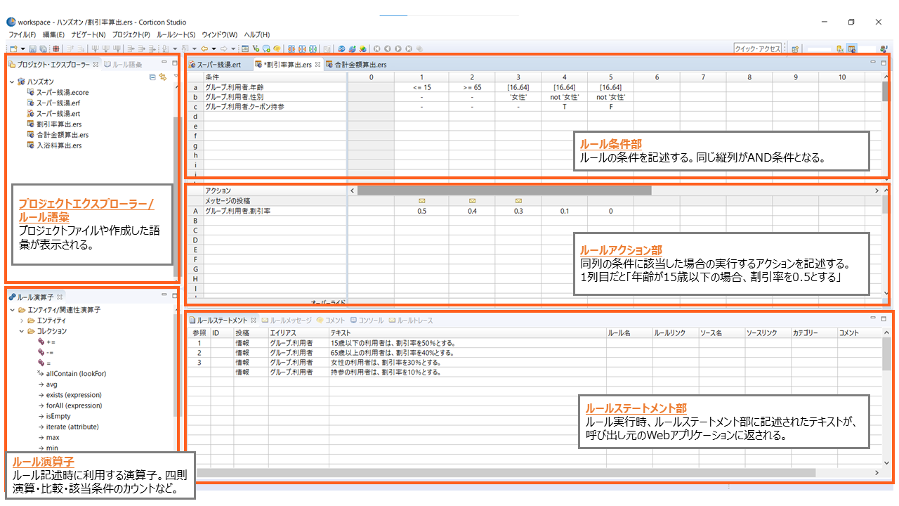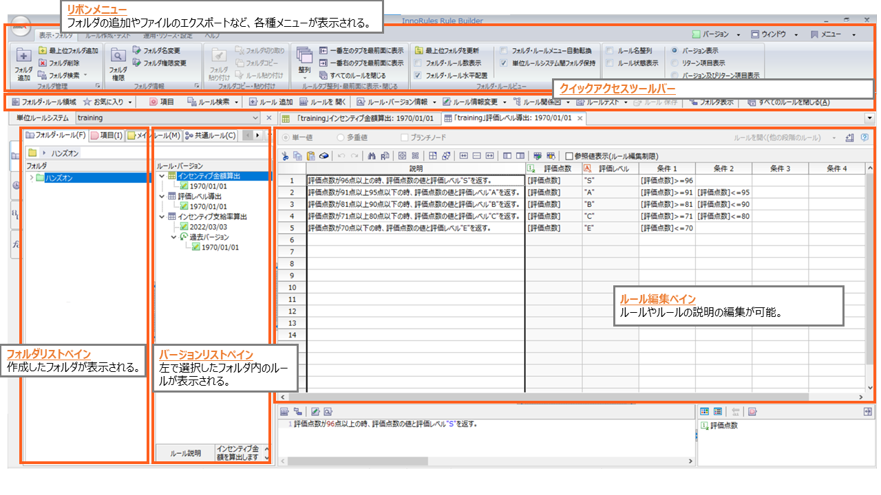 Corticonは「Corticon Studio」というEclipseベースのクライアントツール、InnoRulesは「Rule Builder」というOffice製品ライクなクライアントツールを使って、ルールを作成・管理することができます。