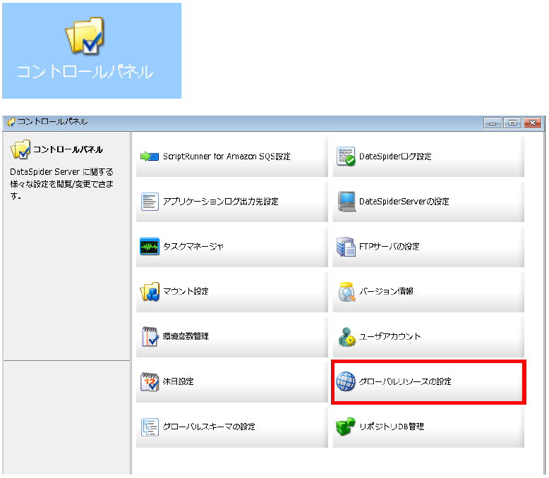 Studioの左下にある、「コントロールパネル」アイコンをダブルクリックし、「グローバルリソースの設定」を選択します。