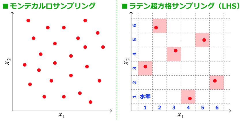 設計変数 x の異なる組み合わせにおいて、目的関数の真値 f (x) を評価(サンプル)します。この作業は「実験計画法(Design of Experiment: DOE)」とも呼ばれ、なるべく少ないサンプルデータで設計変数 x の空間全体を網羅することが理想とされます。サンプルをランダムに生成する方法(いわゆる「モンテカルロサンプリング」)に比べ、生成されるサンプルの直交性(すべての設計変数について、すべての水準が重複なく1回だけ選ばれる状態)を保証する「ラテン超方格サンプリング(Latin Hypercube Sampling: LHS)」[1]が理想的なDOEとして提案されています。