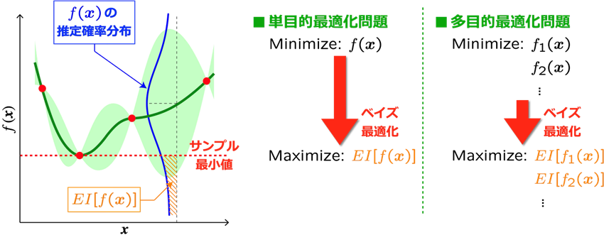 が改善する量を期待値として算出したものです。ベイズ最適化では、形が未知(ブラックボックス)である目的関数