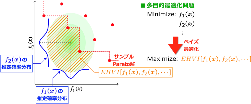 ここでは、多目的のベイズ最適化に特化した獲得関数として提案された「Expected Hypervolume Improvement: EHVI)」[5]を紹介します。EHVIは、これまでに取得したサンプルデータのうちPareto最適解となるものを基準として、改善期待量を複数の目的関数