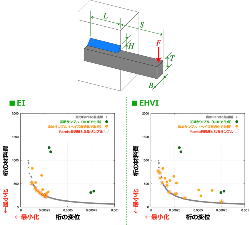 単目的と多目的のベイズ最適化の違いは主に、ステップ3で使用する獲得関数の定義に現れます。先述の獲得関数EIは、各目的関数について個別に算出することで、多目的最適化問題にそのまま応用できます。しかし、EIに基づくベイズ最適化は、多目的最適化問題において無数に存在するPareto最適解[時間がかかる解析の効果を短時間で出すためのAI活用法