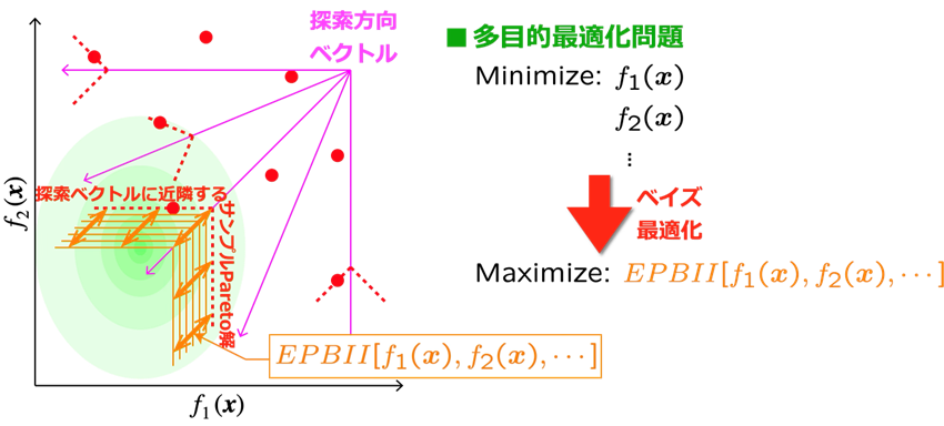 , …の空間内に探索方向ベクトルを複数かつ均等に配置し、各ベクトルに近隣するサンプルデータのうちPareto最適解となるものを基準として、改善期待量を各探索方向に沿う距離として算出したものです。目的関数空間を偏りなく覆う探索方向ベクトルの各々に沿ってPareto最適解の探索が促進されるため、実際の工学設計において有益な情報となる、目的関数のトレードオフの俯瞰的な理解が期待されます。