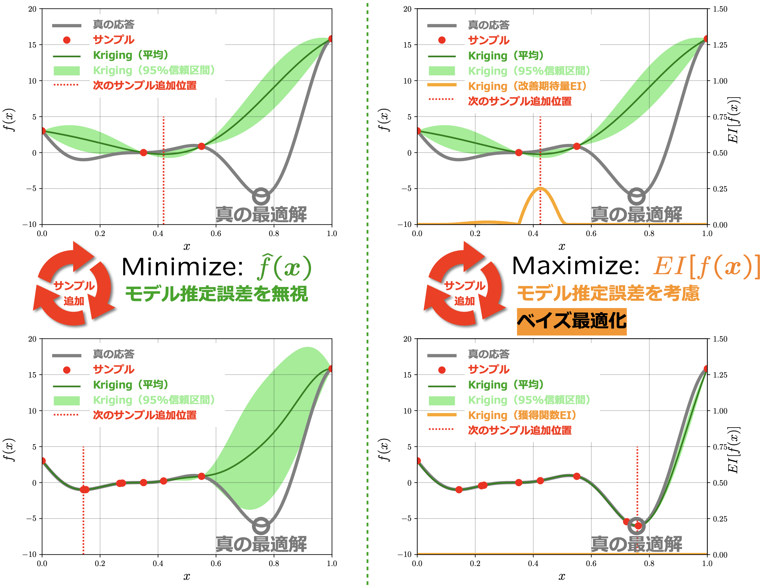 そこで、Krigingを用いて最適解を求める方法を説明します。Krigingがモデル化する関数推定(確率過程の平均)と推定誤差(確率過程の分散)の情報から、これまでに取得したサンプルデータよりも目的関数が改善する量の期待値「改善期待量(Expected Improvement: EI)」[4]を計算できます。そして、EIを最大化する解にサンプルデータを追加していくことで、サロゲートモデルの推定誤差を減らすことと、サロゲートモデル上でより良い解を見つけ出す(最終的には、真の最適解に到達する)ことを同時に成し遂げることができます。このように、サロゲートモデルの誤差情報に基づき、サンプルデータを適宜追加してモデルの正確性を上げながら、最適解の在処を確率論的に探っていく(いわゆる「ベイズの定理」に基づく)ことを「ベイズ最適化」と呼びます。