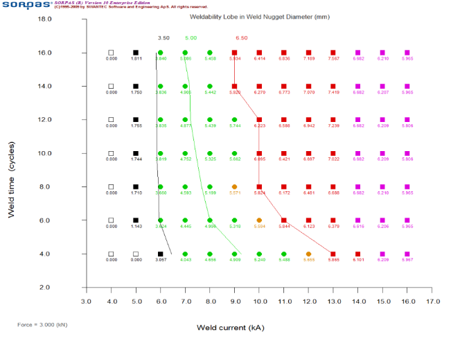 さらに、溶接プロセスの最適化を検討するために、ウェルドカーブの出力やウェルドローブの自動作成を行います。Fig.1はウェルドカーブと呼ばれ、縦軸にナゲット径-横軸に電流値を取り、予め指定した理想のナゲット径の範囲に対応する電流値を探索する機能です。この例ではナゲット径の範囲を4mm~5.8mmで指定した際の電流の良好条件を表示しています。緑で表示されている、7,8,9,10kAが良好な電流値として確認できます。Fig.2は、ウェルドローブを示しており、電流に加えて溶接時間または加圧力のパラメーターを振り、良好な溶接条件の探索を行っています。また、電流値だけでなく、加圧力または溶接時間の最適化を行うことなども有効です。
