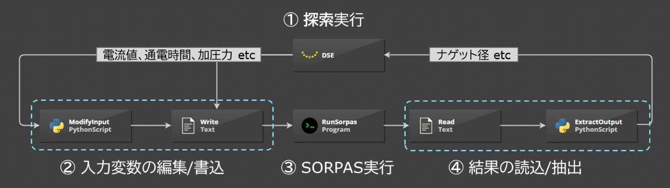 図1はpSeven Desktopで作成したSORPASの自動化ワークフローです。①のDSE(Design Space Exploration)ブロックでは設計変数・目的関数・制約条件が設定されており、最適化・予測モデルにおける入出力条件が定義されています。溶接シミュレーションの最適化では、設計変数に電流値・通電時間・加圧力などの溶接条件、目的関数にナゲット径・溶け込み深さなどの溶接品質、制約条件にスパッタの有無など溶接不良の結果が設定されます。このような条件設定により「溶接不良が発生せず、目的の溶接品質を満足する溶接条件を導出する」ようにシミュレーションを繰り返し実行します。