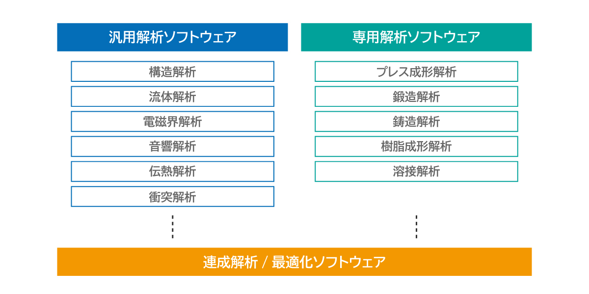 CAEソフトウェアは、解析内容に応じて4つの種類に分けられます。汎用解析ソフトウェア(対象となる物理現象に合わせて用いられる)、各製造工程に特化した専用解析ソフトウェア、複数のソフトウェアを組み合わせる連成解析、あらゆる設計要求を満たす解を導出する最適化ソフトウェアがあります。