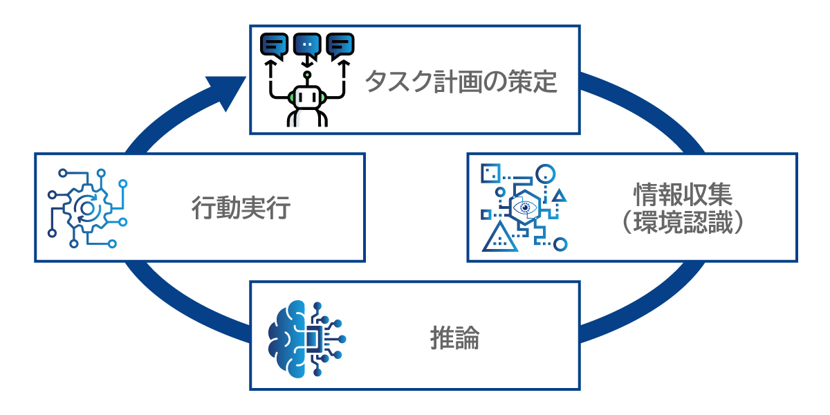 AIエージェントは、タスク計画の策定・情報収集(環境認識)・推論・行動実行の4つのステップを繰り返すことで、自律的に意思決定を行い、目標達成に向けて行動します。各ステップの詳細は以下の通りです。