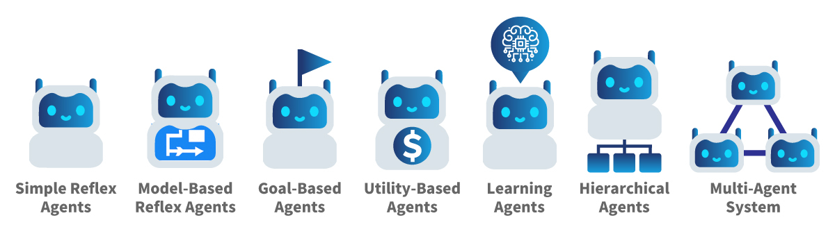 AIエージェントは、目的や機能に応じてさまざまな種類に分類されます。区分や名称は各社によって若干異なりますが、ここでは、代表的な7つのタイプについてご紹介します。