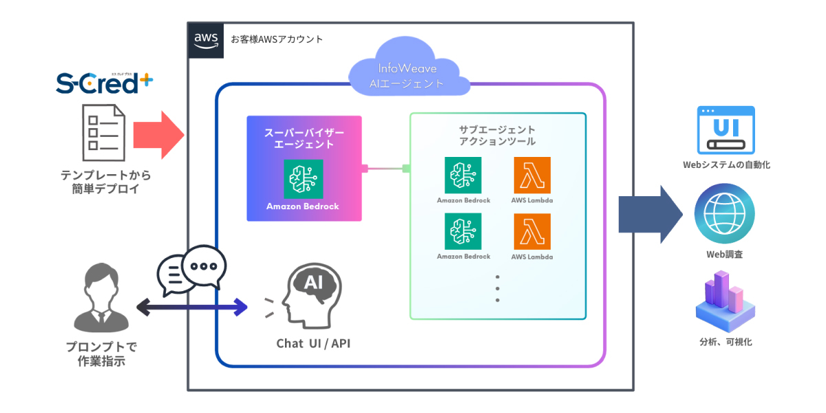 企業のAWSアカウント上に環境を構築するため、社内セキュリティポリシーに沿った環境下で、AIエージェントを業務用途に合わせて迅速にご利用いただけます。