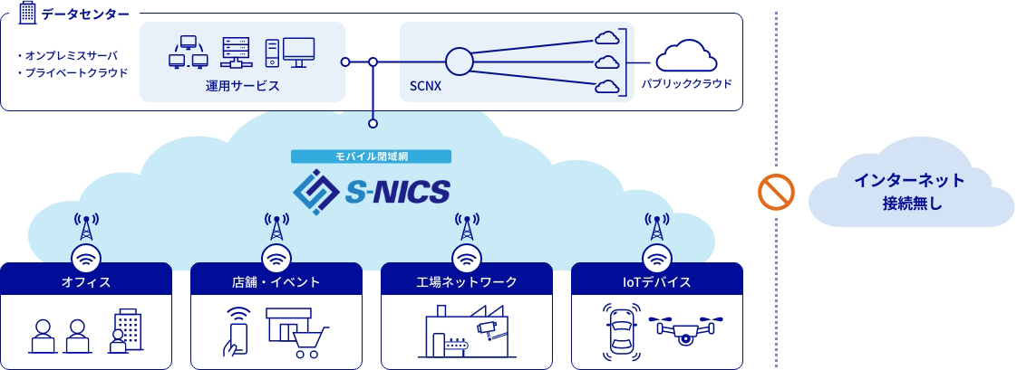 SCSKが提供するデータセンターnetXDCで提供するマルチクラウド接続サービス「SCNX」と組み合わせていただくことで、インターネットを経由せず、SIM搭載モバイルデバイスからクラウド環境までエンド・ツー・エンドで各社クラウドサービスとの閉域ネットワークを構築できます。