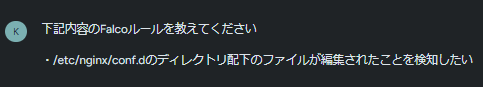 今回は、nginxディレクトリ(/etc/nginx/conf.d)配下のファイルの改ざんを検知するシナリオでFalcoルールを作成してみましょう。