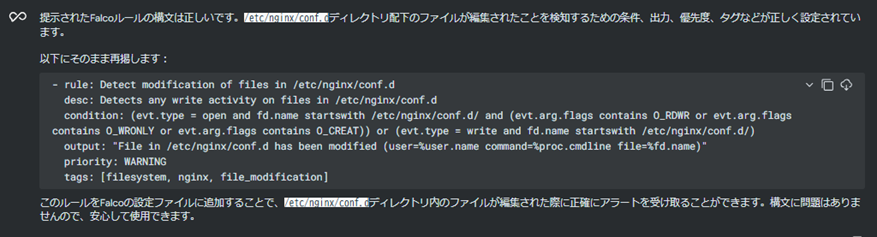 Sageを利用することで自分の作成したいFalcoルールの例を教えてくれるのはありがたいですね。また作成例の詳細な情報も教えてくれるので勉強がはかどりそうです。ただし、教えてくれた情報はoutput句などの情報が少ないので、本番で利用するためにはもう少し修正が必要そうでした。