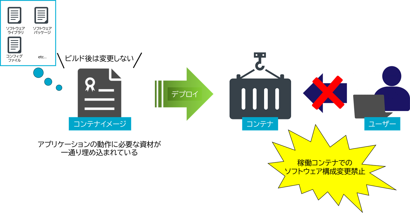 Container Driftは日本語では、「コンテナのずれ」という意味です。コンテナはイメージビルド時にアプリケーションが動くためのソフトウェア構成情報を埋め込むため、デプロイ後のコンテナに変更を加えないことがお作法となります。ご存知の方も多いかと思いますが、デプロイ済みのコンテナに変更を加えないことは、必要な時にいつでも同じアプリケーションを同じ品質で起動できるというコンテナの特長を活かした運用につながります。