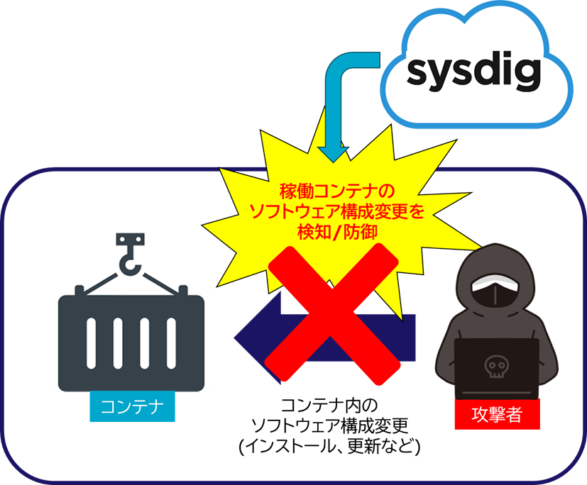この考えに基づくと稼働中のコンテナにソフトウェア構成情報の変更が起きることは通常ないため、変更が起きた(コンテナイメージの内容とずれた)場合は、サイバー攻撃が疑われます。攻撃者はコンテナ侵入後、攻撃ツールのダウンロードや既存ソフトウェアを脆弱なバージョンに変更することがあります。Sysdigは起動中のコンテナ内のソフトウェア構成変更を検知し、変更されたプロセスの実行をブロック(プロセスキル)します。コンテナイメージの時にはインストールされていなかったバイナリファイルの実行をブロックできるので未知のマルウェアにも対応できる点が素晴らしいですね!