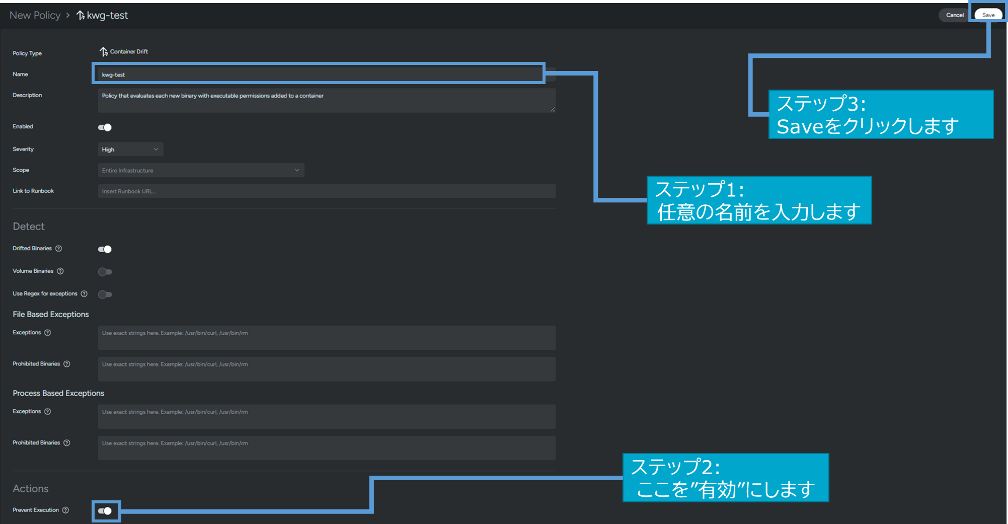 ポリシー作成画面に遷移するのでNameに任意の名前を入力し、Descriptionに任意の値を入力、Prevent Executionのトグルボタンを有効化して"Save"を押すだけです。