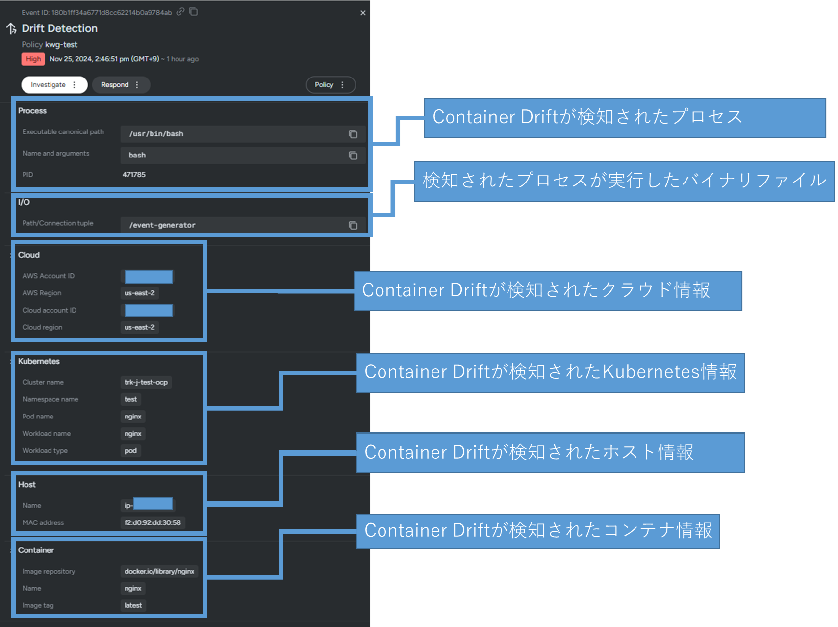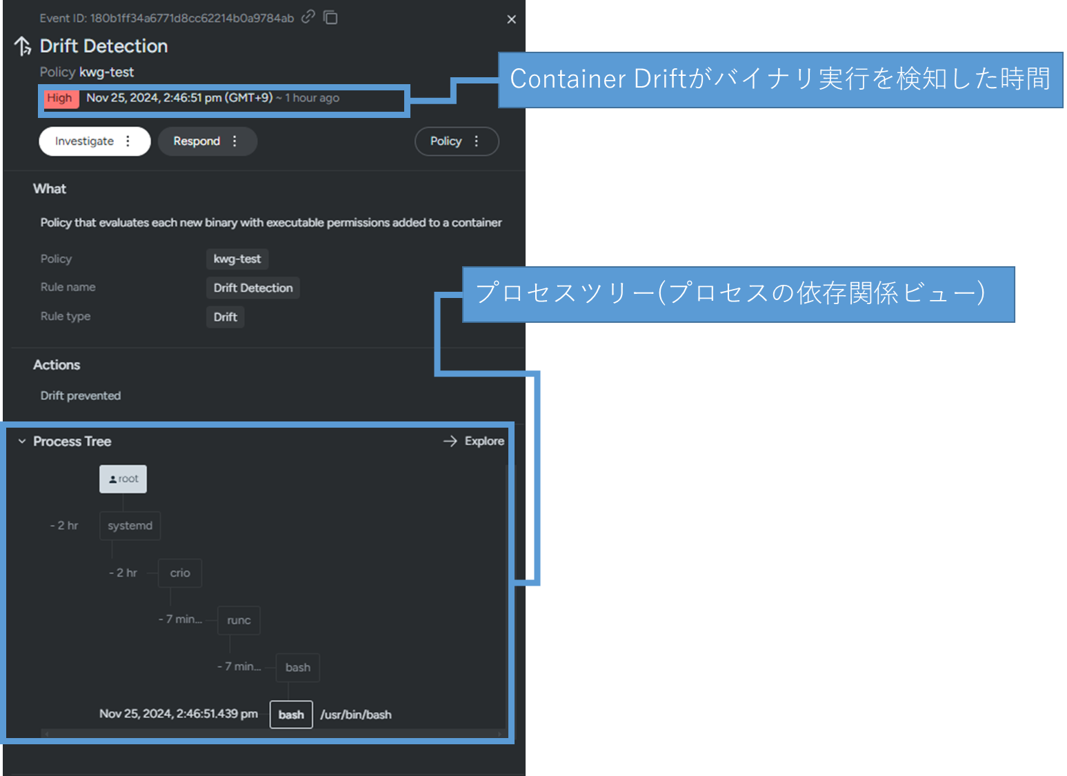 Container Drift実行前後で発生したプロセスがあればそれについても表示されます。プロセスの流れが可視化されるため検知された際の調査がはかどりそうですね!