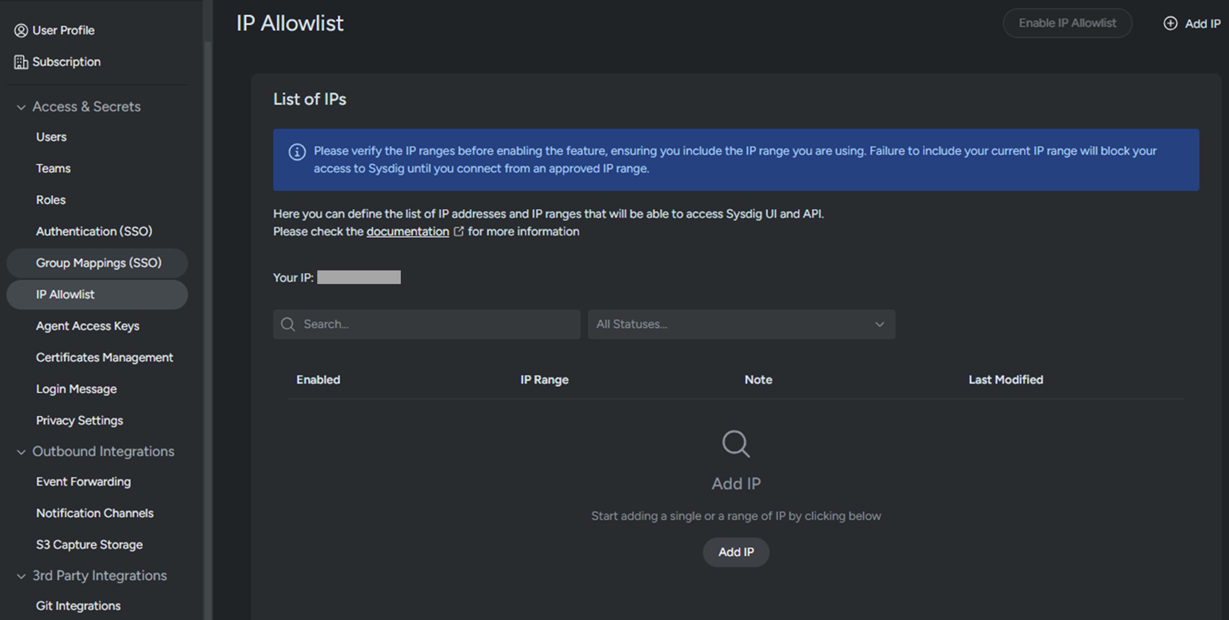 Sysdigの[Setting]に移動し、左側のタブから[IP Allowlist]をクリックします。