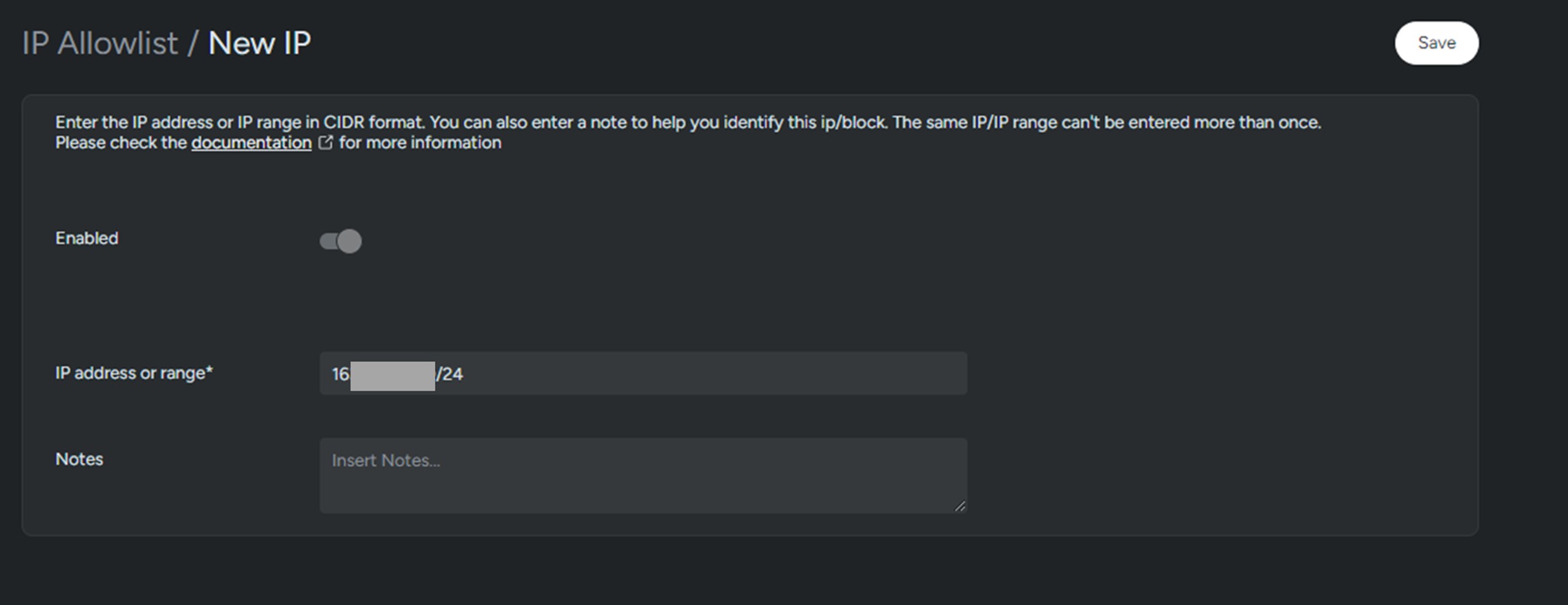 事前準備で確認したグローバルIPアドレスを[IP address or range]に入力し、右上の[Save]をクリックします。