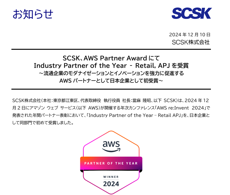 SCSK株式会社は、2024年12月2日にアマゾン ウェブ サービス(以下 AWS)が開催する年次カンファレンス「AWS re:Invent 2024」で発表された年間パートナー表彰において、「Industry Partner of the Year - Retail APJ」を、日本企業として同部門で初めて受賞しました。