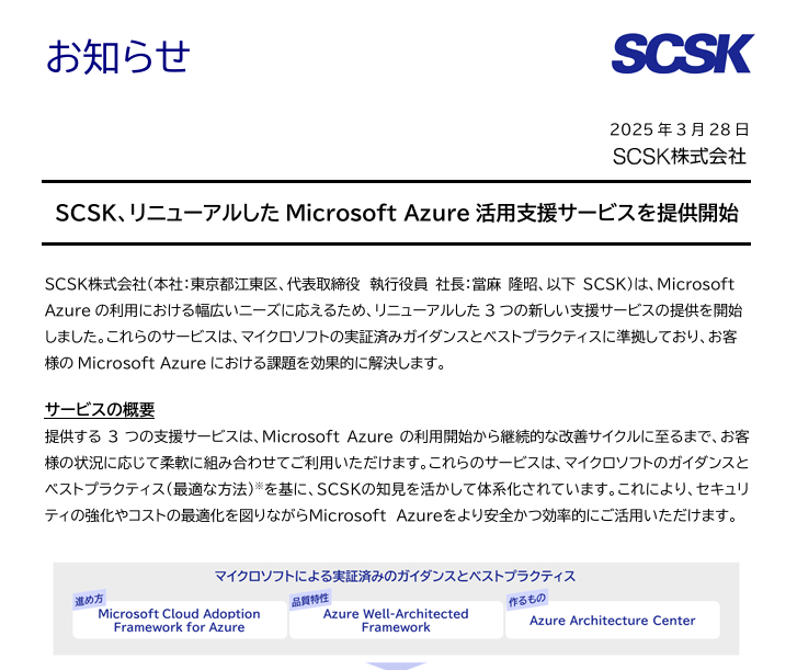 SCSK株式会社は、Microsoft Azureの利用における幅広いニーズに応えるため、リニューアルした3つの新しい支援サービスの提供を開始