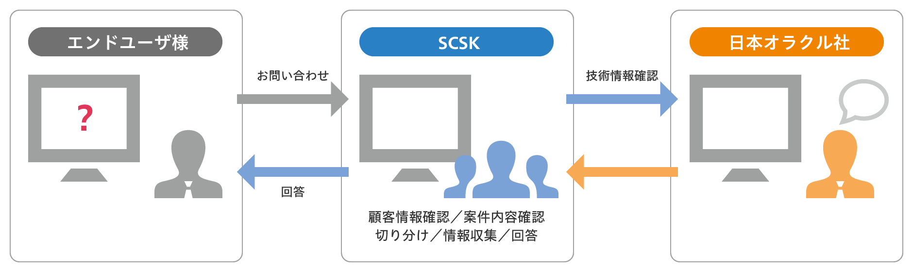 SCSKよりOracle製品のサポートを購入いただきますと、SCSKの一次サポートサービスを提供いたします。