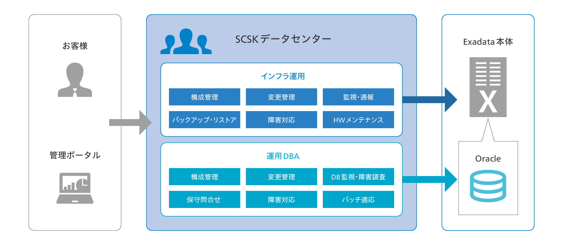 Exadata のNo.1の導入・運用実績※を持つSCSKのオラクル専門技術者によるOracle Databaseの作成、パフォーマンス監視、チューニングなど高レベルな運用を提供、Exadata独自の課題や障害への不安を解消できます。