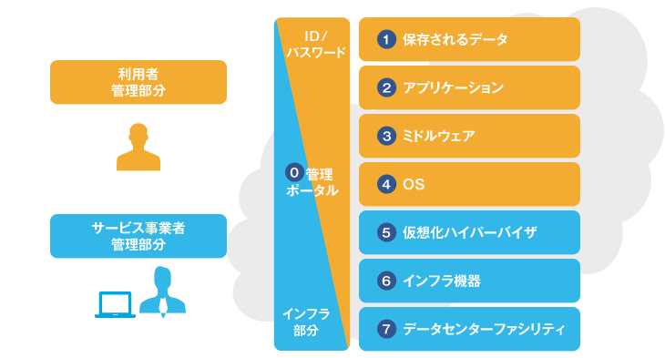 サービス事業者が管理する(責任を持つ)部分 ▷⓪のインフラ部分、⑤⑥⑦