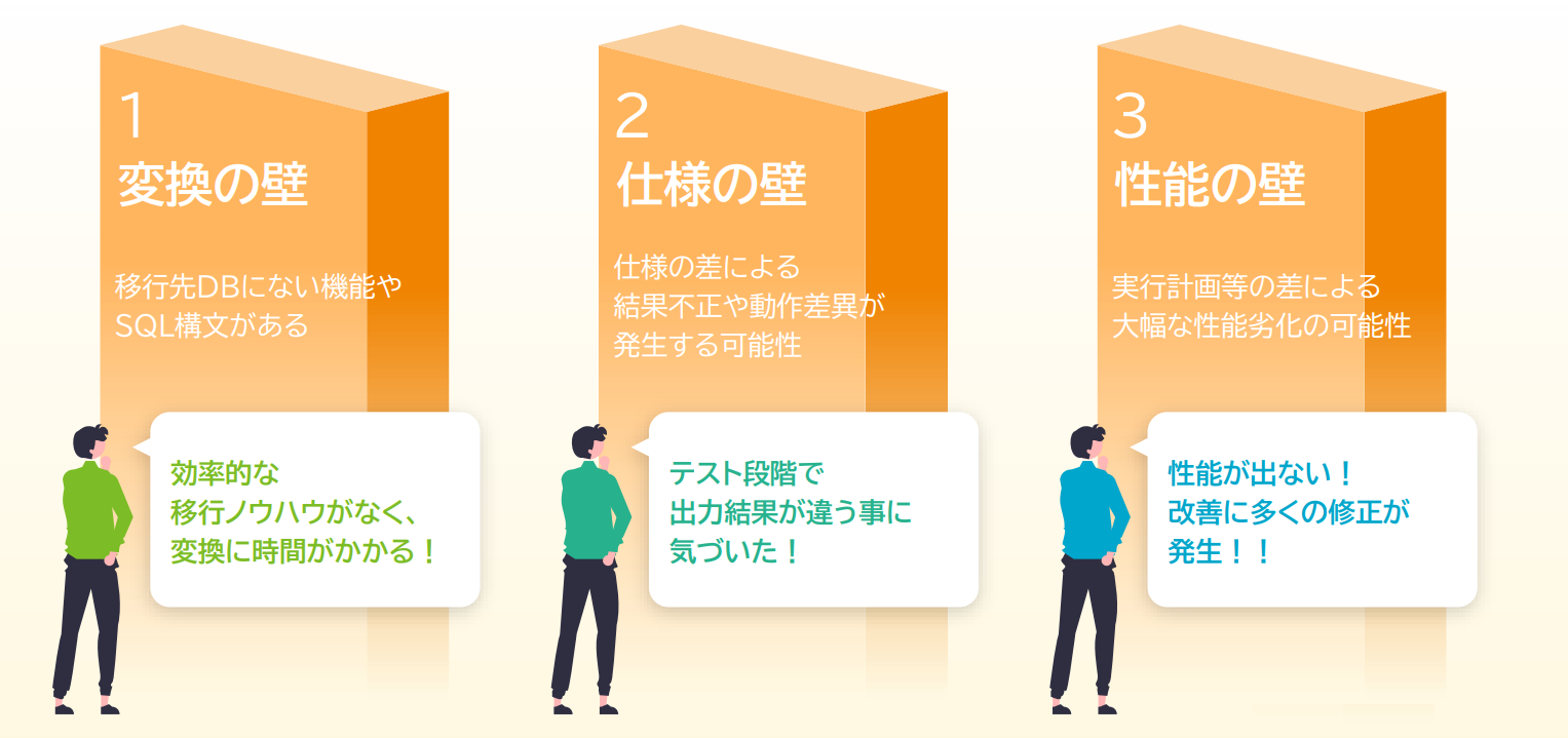 そこで鍵となるのが、OracleからPostgreSQL移行を阻む「3つの壁」を事前に理解しておくことです。