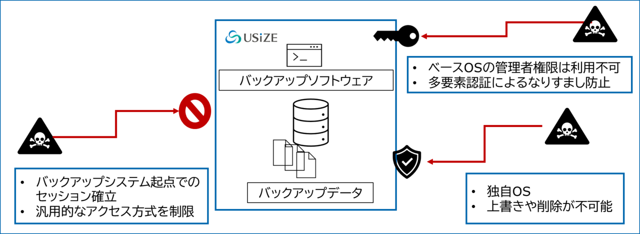 バックアップデータの保護の仕組みとして、USiZEが提供する標準バックアップでは、独自OSや上書きや削除が不可能なイミュータブルファイルシステムという仕組みを実装しています。