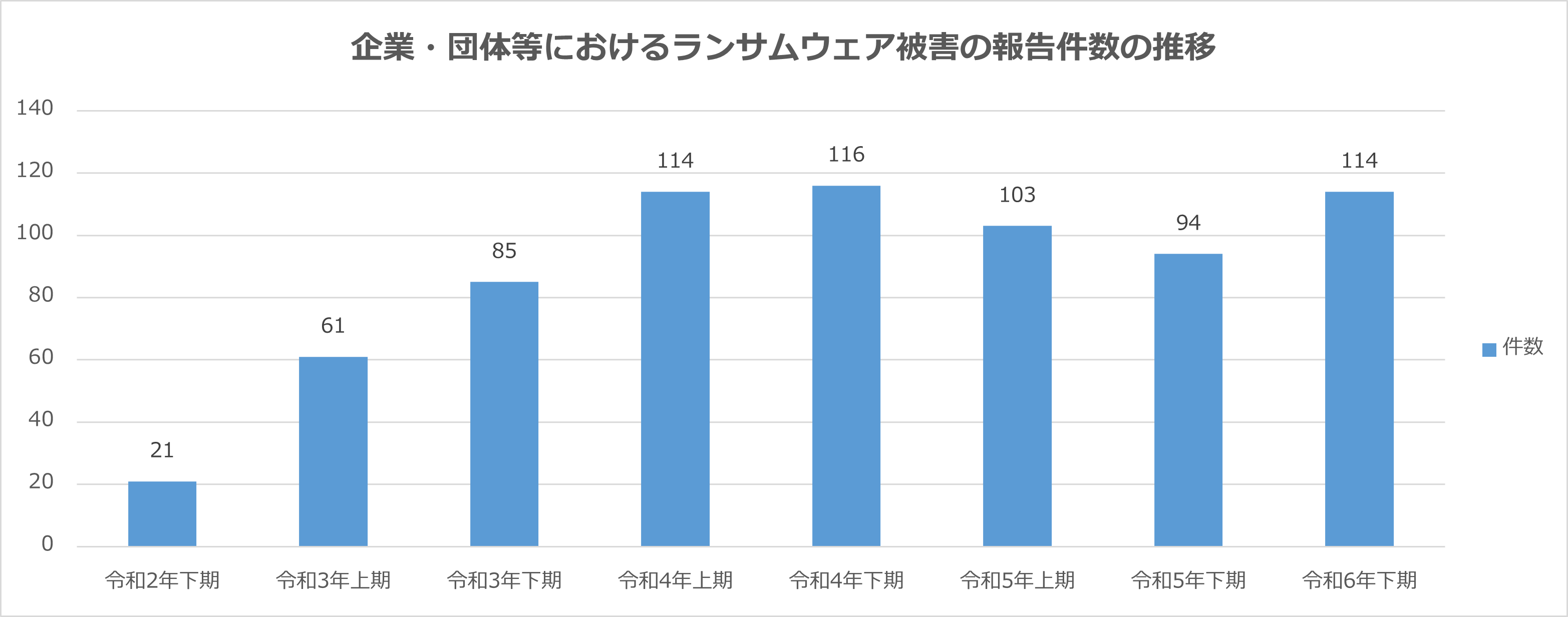 企業・団体等におけるランサムウェア被害として、都道府県警察から警察庁に報告のあった件数は、令和2年(2020年)下期より、右肩上がりで推移し、以降も多くの被害が発生しています。