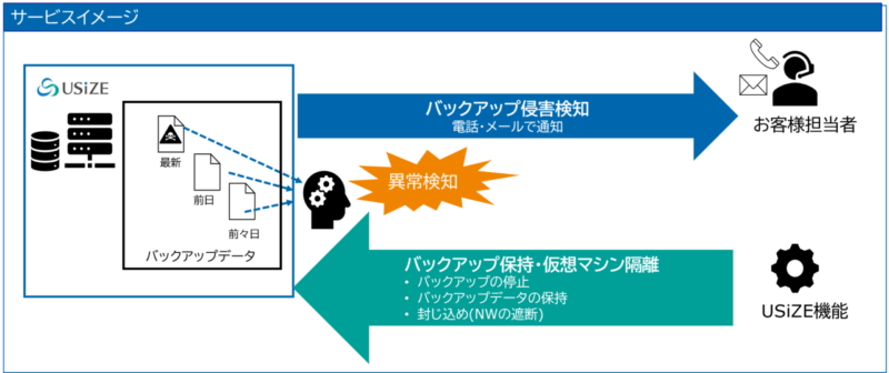 USiZEでは、ランサムウェア攻撃時に、迅速にデータを復旧し、お客様のスムーズな事業復旧支援するランサムウェアサービスをご用意しています。