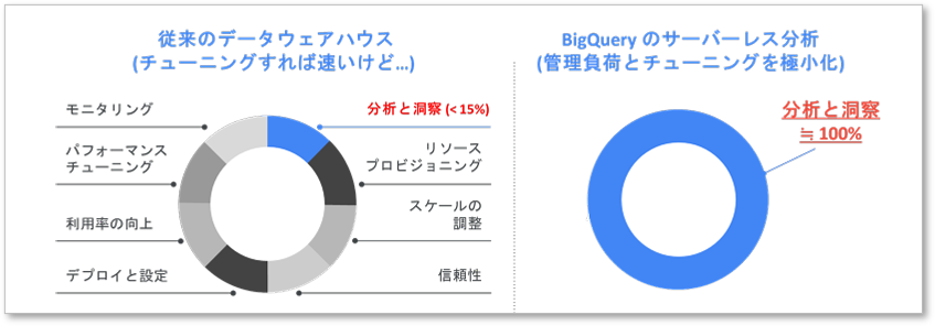 BigQueryは、サーバーの管理や性能を最適な状態に保つための調整が一切不要なサーバーレス基盤です。ユーザーは必要な分だけリソースを利用するだけで済むため、IT担当者は煩雑な「環境管理」から解放され、「分析や施策立案」といった、より本質的な業務に集中できるようになります。